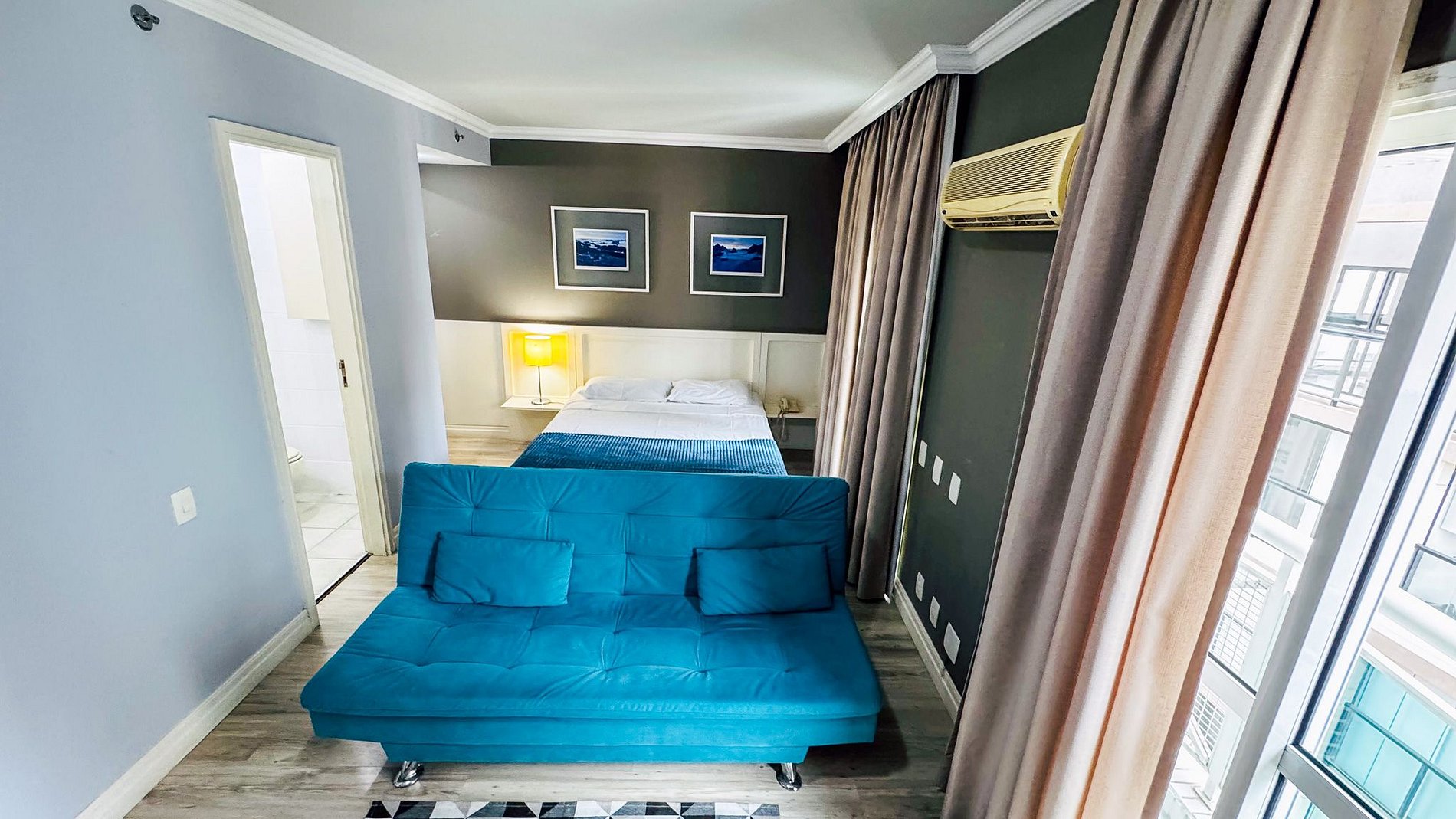 Os quartos dispõem de cama de casal e sofá-cama, acomodando até 04 pessoas, garantindo conforto para todos. Contam com ar-condicionado, mesa de trabalho e varanda com vista da cidade. A internet Wi-Fi é fornecida pelo hotel no check-in, e o enxoval inclui roupa de cama e toalhas de alta qualidade.